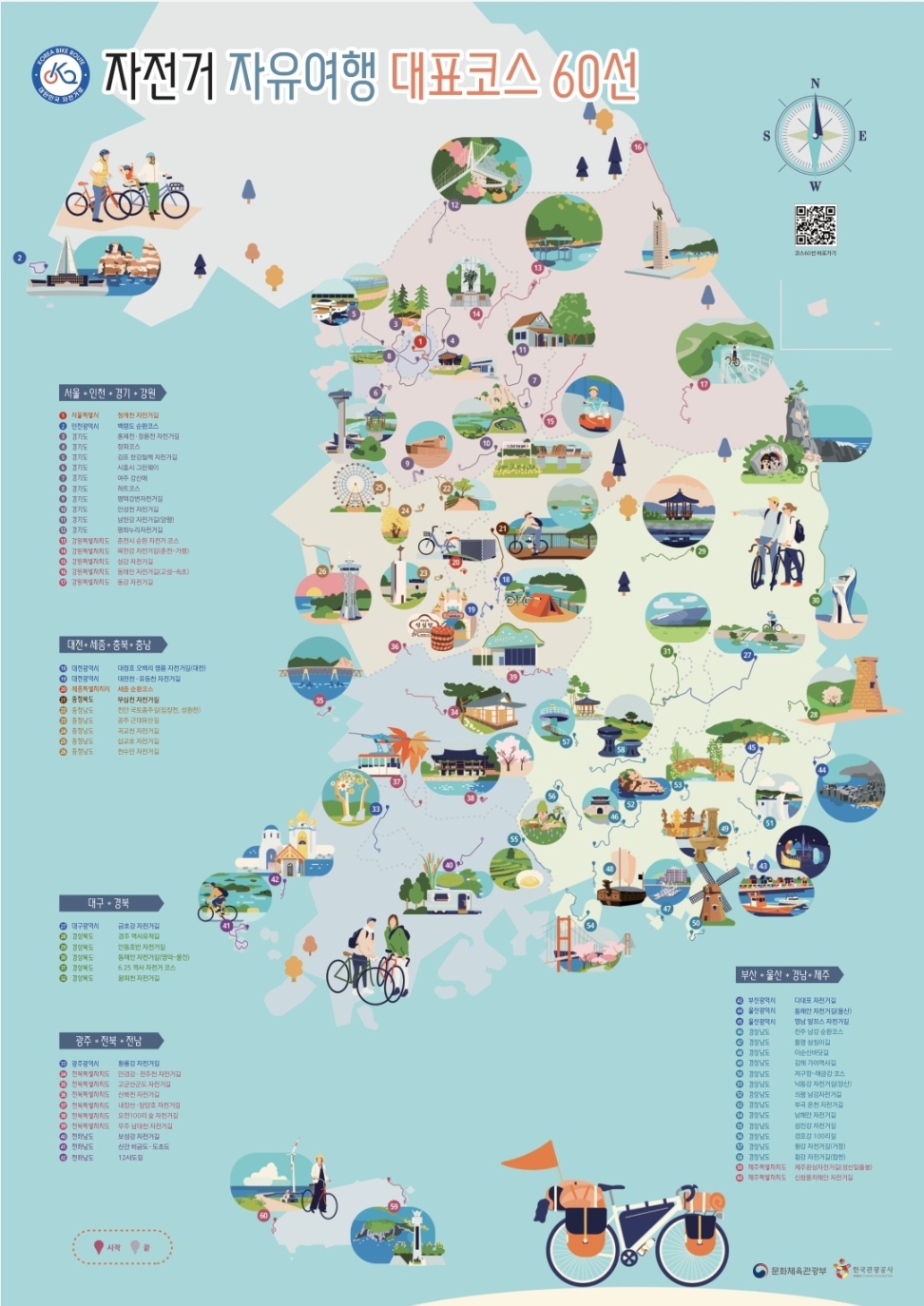 날씨가 따뜻해지면서 자전거를 타기 좋은 계절이 돌아왔습니다. 하지만 전국에 수많은 자전거 도로가 있어 어디로 떠나야 할지 고민되기도 하죠. 이런 고민을 덜어주기 위해 문화체육관광부가 발표한 '자전거 자유여행 대표코스 60선'을 소개하겠습니다.